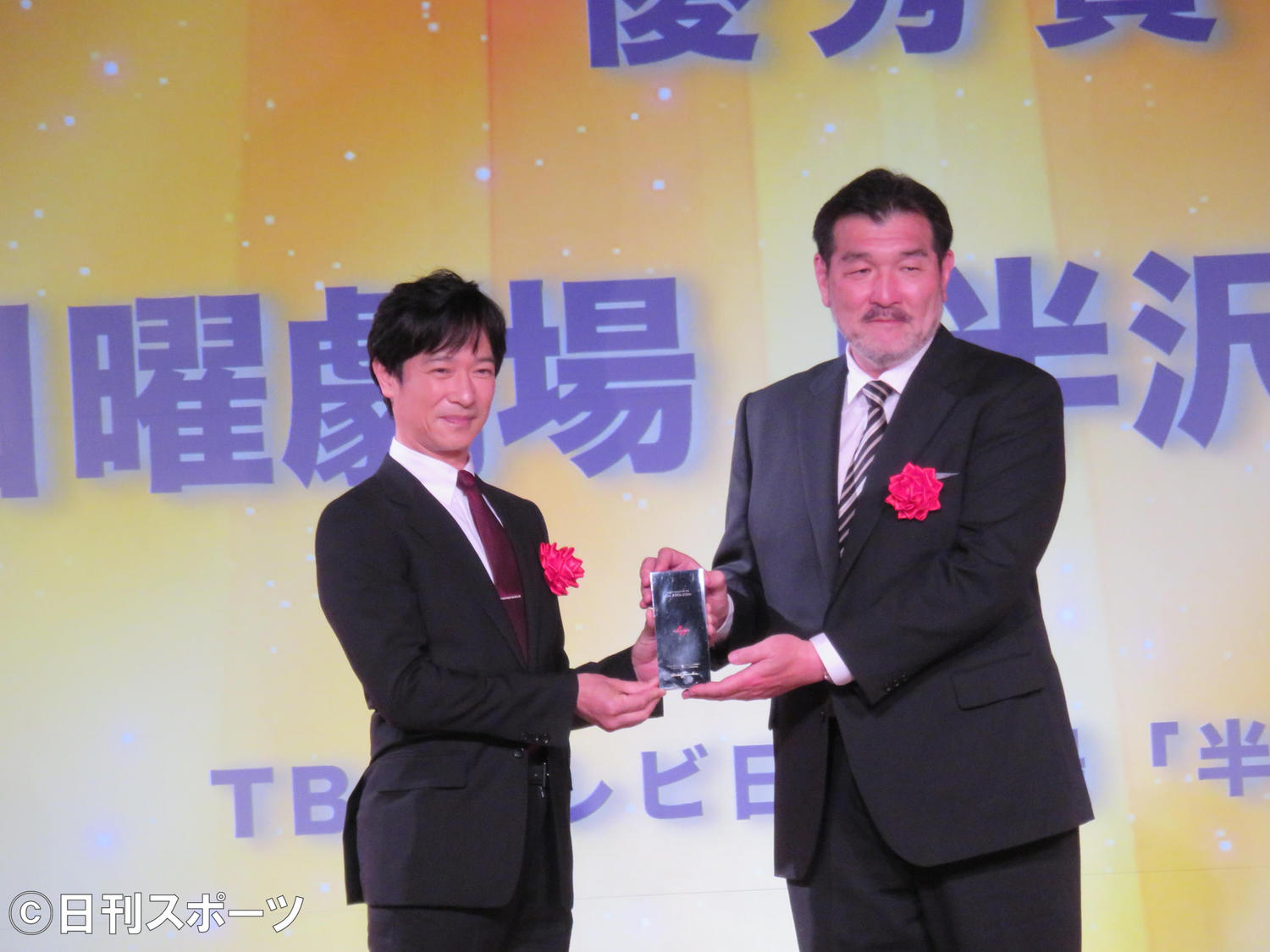 優れたデジタルコンテンツを表彰する「AMDアワード」の表彰式が21日、都内で行われ、優秀賞10作品の中から、TBS系連続ドラマ「半沢直樹」がAMD理事長賞に選ばれ、主演の堺雅人(47)と演出の福沢克雄
