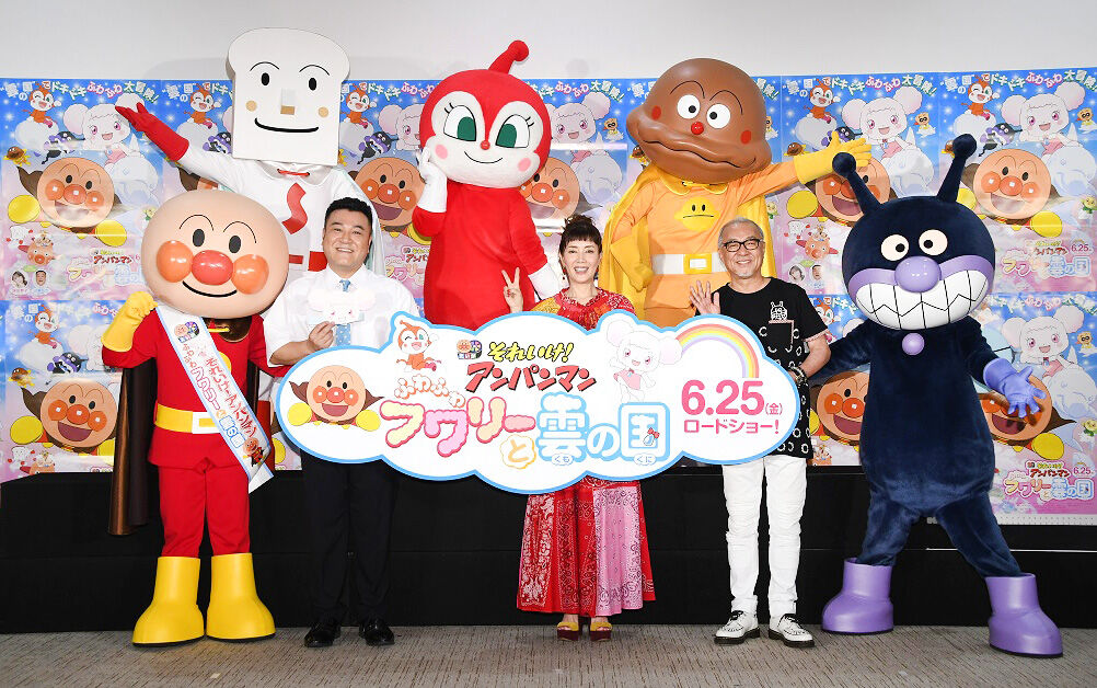 アンパンマン役の声優・戸田恵子、ばいきんまん役の声優・中尾隆聖、お笑いコンビ「アンタッチャブル」の山崎弘也が30日、神奈川・横浜アンパンマンこどもミュージアムで映画「それいけ!アンパンマン ふわふわ