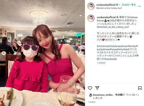 タレントの神田うのさんが12月27日にInstagramを更新。夫と娘と一緒にハワイ・ホノルルのレストランでクリスマスディナーを楽しんだ様子を写真とともに伝えています。 神田さんは海を望むレスト