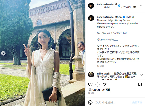 俳優の杏さんが7月6日にInstagramを更新。父親で俳優の渡辺謙さんと2泊3日のイタリア旅行に行ってきたことを、仲むつまじい2ショットとともに報告しました。 杏さんは3枚の写真をアップしなが