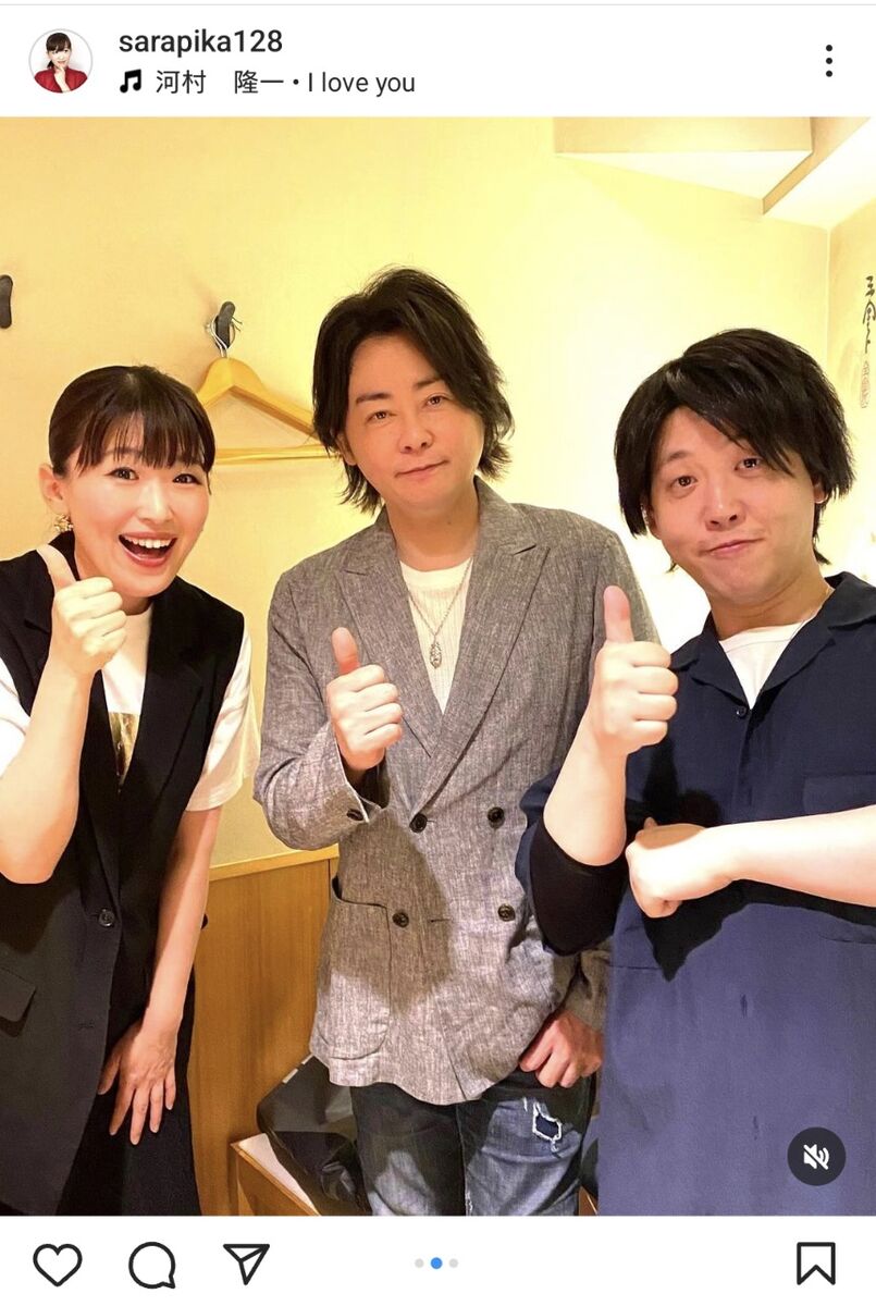 女優・綾瀬はるかのモノマネなどで知られるタレントの沙羅が23日に自身のインスタグラムを更新。ロックバンド「LUNA SEA」のボーカル・河村隆一と会ったことを報告した。 沙羅の夫・たむたむは河村
