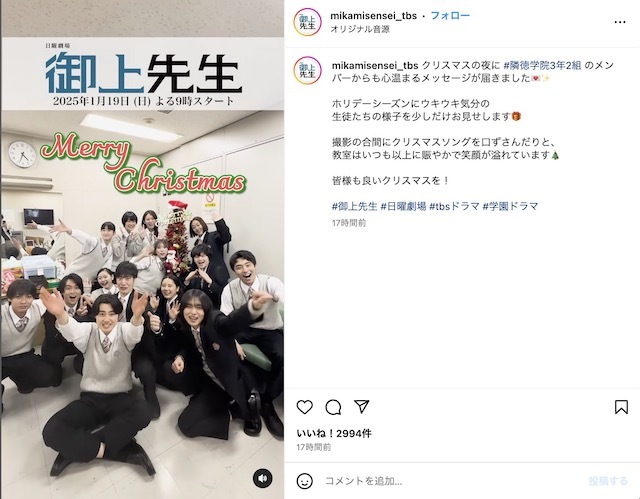 2025年1月19日から放送がスタートする松坂桃李主演のTBS日曜劇場『御上先生』の公式Instagramが更新され、共演する吉岡里帆のクリスマスメッセージ動画が公開された。 『御上先生』は、「
