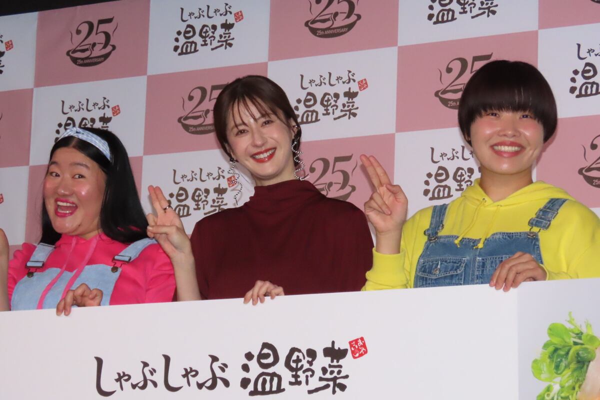 女優、松本若菜(41)が8日、東京都内で行われたCMキャラクターを務めるしゃぶしゃぶ専門店「しゃぶしゃぶ温野菜」の25周年記念発表会に、お笑いコンビ、ガンバレルーヤのまひる(31)、よしこ(34)と出